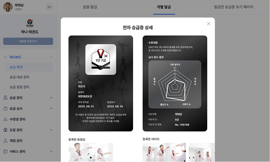 온라인 심사부터 심사 결과 확인, 자동 리포트까지 승급심사를 빠르고 정확하게 운영할 수 있으며, 전자승급증도 버튼 하나로 발급할 수 있습니다